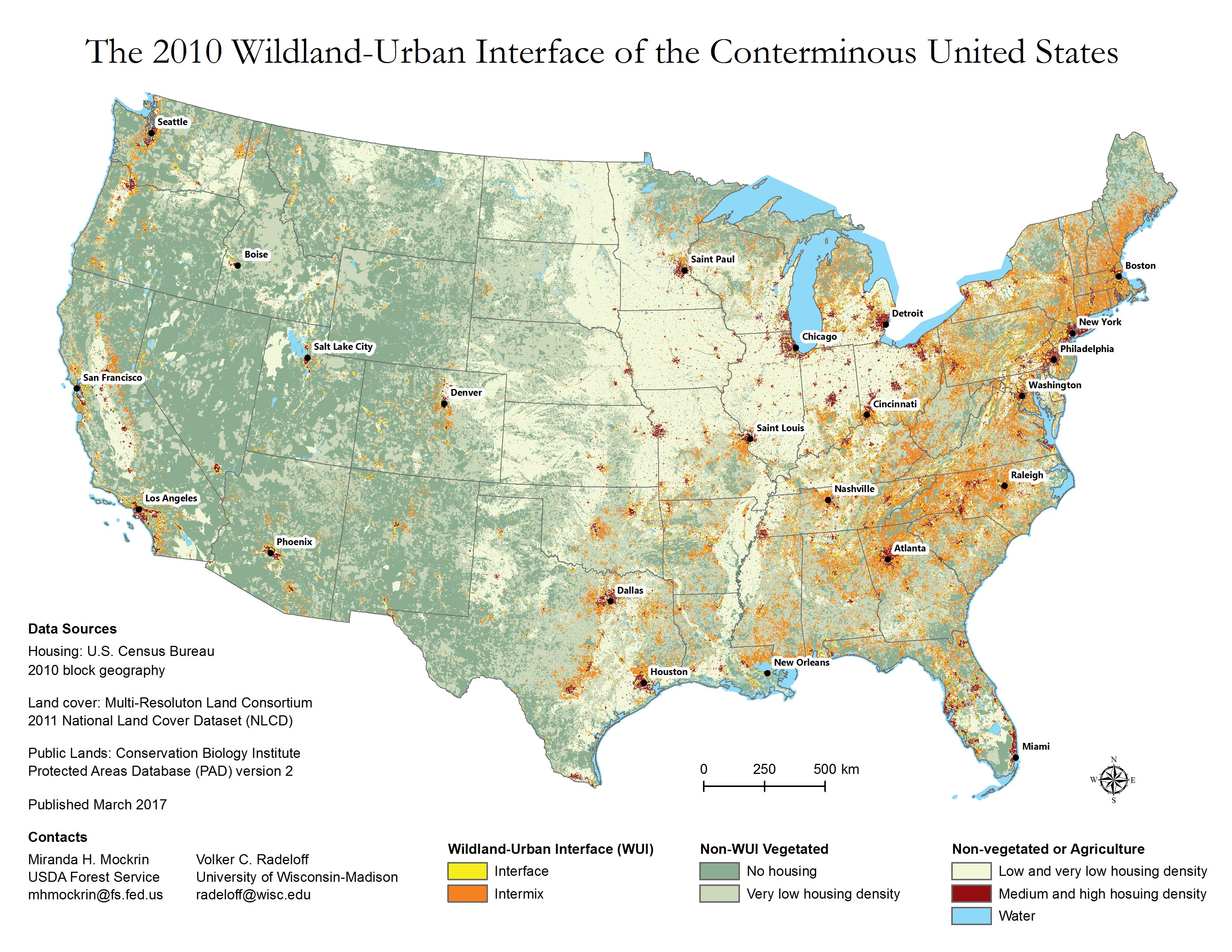 Description: The wildland-urban interface (WUI) is the area where houses meet or intermingle with undeveloped wildland vegetation. This makes the WUI a focal area for human-environment conflicts such as wildland fires, habitat fragmentation, invasive species, and biodiversity decline. Using geographic information systems (GIS), we integrated U.S. Census and USGS National Land Cover Data, to map the Federal Register definition of WUI (Federal Register 66:751, 2001) for the conterminous United States from 1990-2010. These data are useful within a GIS for mapping and analysis at national, state, and local levels. Data are available as a geodatabase and include information such as housing and population densities for 1990, 2000, and 2010; wildland vegetation percentages for 1992, 2001, and 2011; as well as WUI classes in 1990, 2000, and 2010.